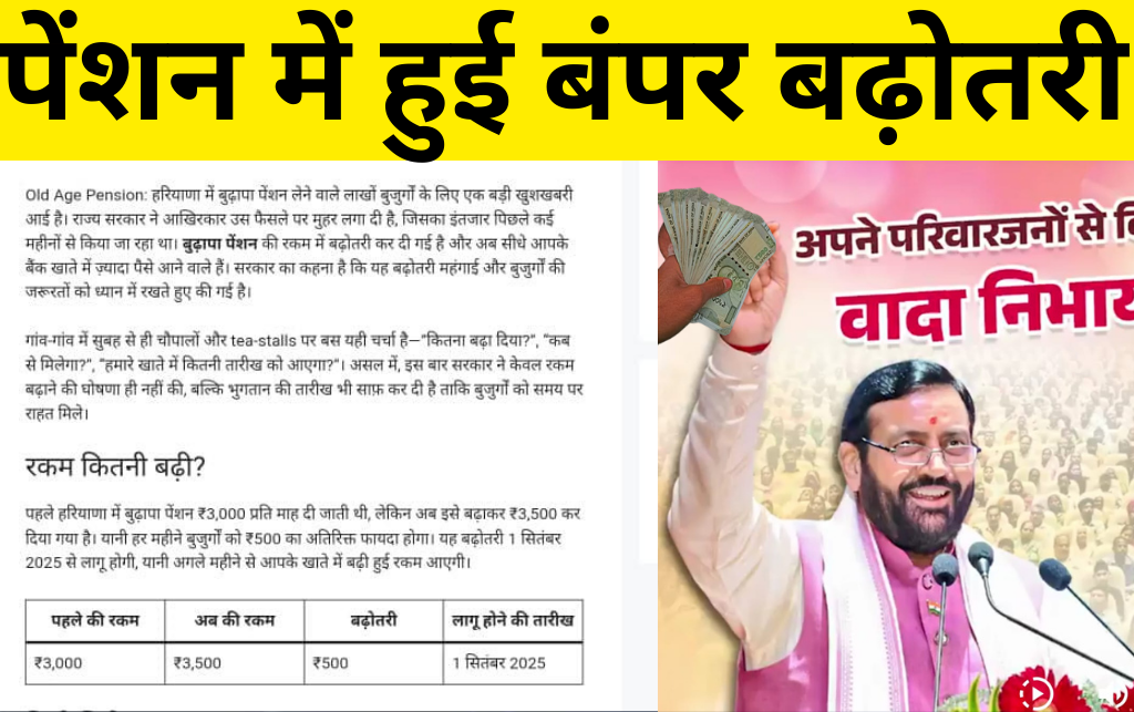 पहले हरियाणा में बुढ़ापा पेंशन ₹3,000 प्रति माह दी जाती थी, लेकिन अब इसे बढ़ाकर ₹3,500 कर दिया गया है। यानी हर महीने बुजुर्गों को ₹500 का अतिरिक्त फायदा होगा। यह बढ़ोतरी 1 सितंबर 2025 से लागू होगी, यानी अगले महीने से आपके खाते में बढ़ी हुई रकम आएगी।